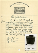 Kaffekvarn, av barrträ. Paralelltrapegoidisk grundform, med svängda kortsidor. Målad i röd o brunt. I tvenne hopspikade stycken, övre delen med tratt, nedre delen med trissa med vev. Trissan snedrefflad. Vev och trissa av järn. Avsedd att hänga på vägg.