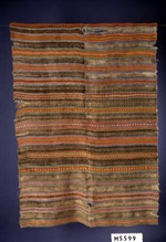Fälltäcke. Linnevarp med fint ylleinslag. Smått, randigt mönster med långa trådar på avigsidan. Rött, vitt bomullsgarn, grönt, gult bomullsgarn. Oblekt linne. Två våder hoppsydda. Storlek 118 x 170 cm.