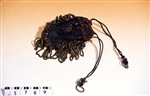 Pung, av mörkbrunt läder med dragsko och lädersnören. Runt sidorna mässingkedjor, fästa vid gula, blå och bruna glaspärlor. Lappskt arbete. Gåva: stud. Wikström.