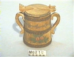 Dryckeskanna. Av trä. Laggad. Med järnband. Två handtag den ena skadat. Målad i gulbrunt. Runt kannan växtrankor och enstaka blomsterornament i grönt rött och vitt. Locket med kant i grönt och rött, itu slaget., Märkt å undersidan: IPF 1866.