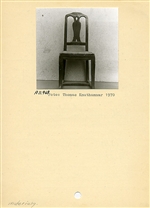 Stol. Ryggen har genombruten balusterbricka och profilerat överstycke. Grova ben, de främre knappt märkbart böjda. Främre delen av sargen svagt bågböjd och försedd med rak, bred skuren ränna som dekor. H-kryss. Målad i mörkbrunt, rödbrun färg under. Svartmålad sits. Träpluggad.