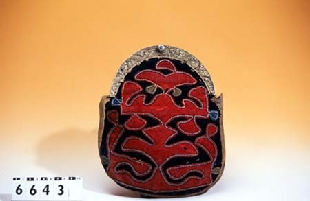 Kjolväska av svart, tuskaftvävt ylletyg. Tuskaftvävt linnefoder. Skinnbaksida. Mellanlägg av skinn. Ofodrad. Skinnkantad. Applikationer av huvudsakligen rött, detaljer av blått och grönt tuskaftvävt ylle. Symmetriskt stiliserat mönster. Konturer av spunnen tenntråd. Mässingsbygel med gjutet akantusmönster.