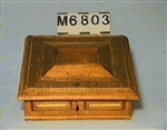 Skrin, av barock, av lövträ. Krafligt profilerade fyllningar med hopplister å locket och framsidan. Å kortsidorna och baksidan akantusrankor i låg relief, inramade av hopplister. Spår av röd och grön målning. Pulpetlock. Invändigt rödmålat med en "avsats". Ena kortsidan ny.