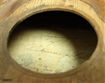 Inuti, vid ljudhålet, sitter en lapp med delvis otydlig text "Förfärdigad af Snickaren A, Löfgren ..knö? Den ..? 57"