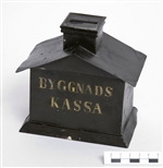 Sparbössa, av plåt. I form av hus med sadeltak med skorsten. Svartgrön färg. Inskrift i gulvitt: "Byggnads kassa". (Ur lappkatalogen).