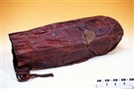 Skinnpung, av tunnt, rödbrunt skinn. Långsträckt oval form, söm i ena sidan, (med infälld liten kil). Vid mynningen utsvängd till ett utskott, vari en läderremsa med två fria ändar är fäst. Botten av ett spetsovalt, infällt stycke.