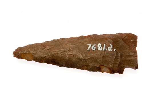 Flintspets, (avbruten dolk?) brun flinta. (ur lappkatalogen).