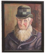 Porträtt av äldre fiskare i kyrkhatt, Pelle Rönnås, Lövvvik, Nora. Som äldre, bröstbild, fas, huvudet i fjärdedelsprofil åt vänster, blå ögon, blicken mot åskådaren, hög färg, grått hår, kransskägg som bildar kraftigt helskägg. Han bär blågrå hatt med uppvikt brätte, rektangulära mönster på kullen, blågrå knäppt rock med stora slag. Gult och brunt skiftande bakgrund.