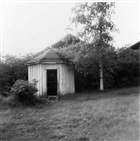 Kruthorn med tillbehör. Består av horn med botten av trä, vilken pliggats fast, samt propp av trä. Genom hornets "rygg" är borrat ett hål genom vilket en rem är dragen. Del två är en oval skinnpåse med en söm och pipan av horn. I påsen sitter en rem. Del tre är en rektangulär skinnpåse med två sidsömmar. Vid sidsömmarna sitter en rem fäst. Remmarna från de skilda delarna sitter fast i mässingsring. I mässingsringen sitter även ett flätat ylleband i vitt, grönt och rött.