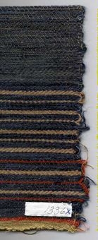 Möbeltygsprov i kypert. Varp i beige bomullsgarn och inslag i blått, blågrönt, rostrött, och beige ullgarn samt blått och brunt lingarn.Väven har stadkanter.