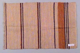 Vävprov i tuskaftsbindning. Varp i oblekt lingarn och inslag i gulbeige, svart och rostrött ullgarn samt blått, gult och blekt lingarn. Det blå lingarnet är sammanspolat med det svarta ullgarnet, det gula lingarnet är sammanspolat med det roströda ullgarnet och det blekta lingarnet med det gulbeigea ullgarnet. Mönstret utgörs av smala svarta och roströda ränder på en gulbeige botten.Mönstereffekt har skapats på vissa partier genom att inslagstrådar ömsom löper över och ömsom under ett varierande antal varptrådar.Provet är ofållat.
