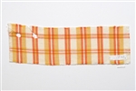 Vävprov i tuskaft. Varp och inslag i gult, orange och naturvitt bomullsgarn. Kulörta ränder i varp- och inslagsriktning bildar ett rutmönster på en naturvit botten.Väven har en stadkant, övriga kanter är klippta och i ena hörnet finns två uppklippta hål.