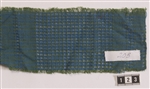 Vävprov i tuskaft och myggtjäll. Varp i grönt bomullsgarn och inslag i blått bomullsgarn. I varpriktningen skapas en mönstereffekt i tuskaft och myggtjäll. Längs stadkanten ett parti med två ränder i tuskaft om 20 mm och mellanliggande myggtjäll om 10 mm. Därefter myggtjäll i i ett 100 mm brett parti. Samma effekt upprepas därefter. Provet har en stadkant och övriga sidor ofållade.