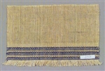 Vävprov i tuskaft. Varp i naturvitt och gult bomullsgarn och inslag i blått bomullsgarn och oblekt lingarn. Ett av de naturvita garnerna i varpen är mercericerat.Varptrådarna har varpats fyra och fyra men den ordning i vilken de varpats har frångåtts vid solvningen.Mönstret utgörs av smala blå bårder i vävens nedre del på en naturvit botten. Längs den ena sidan finns korta fransar av varptrådar.