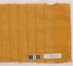 Vävprov i tuskaft. Varp i orange bomullsgarn och inslag i gult bomullsgarn. Orangea ränder utgör bårder på orange botten. De orangea ränderna omges av trådar i samma färg som solvats tre trådar i solv och rör. Väven har en stadkant och tre klippta kanter.