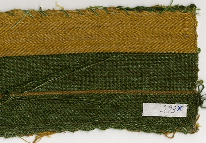 Möbeltygsprov i oliksidig kypert, spetskypert och tuskaft. Varp i grått bomullsgarn. Inslag i två nyanser grönt och tre nyanser gult ullgarn samt gult och två nyanser grönt lingarn. Två trådar i varje inslag med olika färgnyans- och materialkombinationer. En del i gult med spetskypert och en del i grönt med oliksidig kypert och en gul smal rand i tuskaft. En bit om 50 mm x 365 mm bortklippt. Provet har en stadkant. Kastsöm i grönt lingarn och ullgarn längs långa sidor samt en sida ofållad.