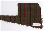 Vävprov i kypert. Varp i rött och grönt ullgarn och inslag i grönbrunt ullgarn.Mönstret utgörs av smala röda ränder i varp- och inslagsriktning som bildar ett rutmönster på en mörkgrön botten.Provets samtliga kanter saknar fållar. En bit har också klippts ur väven.