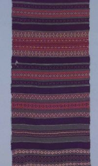 Bordslöpare i bunden rosengång. Varp i oblekt lingarn och inslag i brunt, rödrosa, grönt, vitt och ljusbrunt ullgarn. Enfärgade ränder delar av de mönstrade partierna. Löparen har knutna fransar på kortsidorna varav den ena fransen är 200 mm och den andra är 130 mm lång.Löparen på inv.nr 328 är en variation på denna mönster- och färgkomposition.