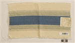 Två stycken vävprover i tuskaft och kypert.Inv.nr 3380:1 Varp i naturvitt bomullsgarn och inslag i halvblekt, blått och två nyanser grått lingarn. Grå kypertränder i två olika bredder omger ett brett, blått parti i kypert.En etikett är fäst invid ena stadkanten:"ÅNGERMANLANDS HEM- SLÖJDS AVD. Tel. 1327 HÄRNÖSAND______________________Pris pr m 10:50 10:95 (båda prisuppgifterna är överstrukna/ reg. anm.)Bredd c:a 30cmLit. 11:15/mtrN:r Red Proven torde franco åter- sändas inom 4 dagar.2-6-61"På baksidan av etiketten står uppgifterna "ink 31/12 -61 3,8m" skrivna med blyerts.Väven fanns troligen i produktion hos Ångermanlands Hemslöjd i Härnösand omkr. år 1961.Provet har stadkanter, övriga kanter saknar fållar.Längd: 170mm Bredd: 315mmInv.nr 3380:2 Varp i naturvitt bomullsgarn och inslag i halvblekt, grönt och två nyanser blått lingarn. C:a 2/3 av väven täcks av kulörta kypertränder. 1/3 av provet är omönstrat och vävt i tuskaft. Provet har stadkanter, övriga kanter saknar fållar.Längd: 135mm Bredd: 310mm