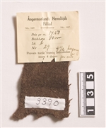 Berett yllevävprov i kypert. Varp och inslag i brunt ullgarn. Provet har två stadkanter och två klippta kanter. På tyget sitter en pappersetikett fastsydd, med texten:" Ångermanlands Hemslöjds FilialTEL.1327 HÄRNÖSAND TEL. 1327Pris pr m. 14:50Bredd c:a 80 cmLit. 2N:r 29 4 1/2 kupong pr meter.Proven torde franco återsändas inom 4 dagar."