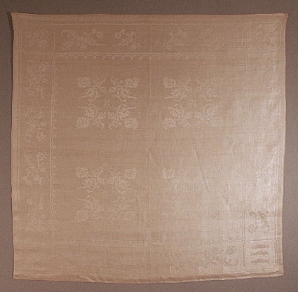 Servett i damast. Varp och inslag i halvblekt lingarn. Ett mönster med rosenkvistar som bildar fyra kvadrater finns på mittfältet. Ett annat mönster av rosenkvistar dekorerar bården. I bårdens ena hörm finns Ångermanlands landskapsvapen - tre laxar. I ett annat hörn är prins Gustaf-Adolfs och prinsessan Sibyllas monogram -G A S - invävt. Dukar och sevetter i detta mönster vävdes som lysningspresent från Västernorrlandsläns kvinnor till prins Gustaf Adolf och prinsessan Sibylla 1932 och vävdes endast till detta tillfälle. Mönstertecknare var Gulli Lundquister. De sju dussin servetter som beställdes vävdes av Ester Hägerström, syster till Emma Wiberg. Dukarna vävdes av Emma Wiberg.Se även inv.nr 3099 och 3495.Gulli Lundquister var chef och mönstertecknare vid Ångermanlands hemslöjd i Sollefteå under två perioder: maj 1924 - september 1927 och september 1929 - juni 1936. Gulli har till övervägande del tecknat mönstren till Emma Wibergs damast-vävnader. Mönstren utgörs mestadels av stiliserade blommotiv och är tecknade så att på rätsidan framstår mönstret i varpeffekt och bottnen i inslagseffekt.