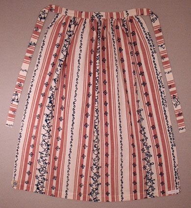 Förkläde i långrandigt bomullstyg i naturvitt och rosa med tryckt blått blommönster i längsgående bårder. Förklädet är sytt på maskin. Linningen och knytbanden är gjorda av samma stycke. Den totala längden är 1300 mm, varav linningen utgör 300 mm. Tyget är jämt rynkat vid linningen. I fållen är det fäst en pappersetikett med SVENSK SLÖJD emblem i blått och gult. På baksidan står det "Ångermanlands Hemslöjdsförening" och handskrivet "17:20". Längs med ena stadkanten upprepas den trykta texten "ÅNGERMANLAND [?]-tryck av Klofve".Förklädet är en nyproduktion inspirerat av ett äldre original, en kjol från Ramsele sn.Se två kartongblad 1340 med kolorerat foto och två tygprover med tillhörande registerkort med text:"Kjol av lärft från Ramsele sn. 70 rör på 10 cm. Tillhör fröken Anna Eriksson. Sel. Kjolen har varit längre och vidare. Tryckt bård och tryckta rankor."