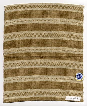 Vävprov i tuskaft och rosengång. Varp i oblekt lingarn och inslag i oblekt och halvblekt lingarn. Mönstret utgörs av rosengångsmönstrade bårder på en tuskaftsbotten.Provet har stadkanter och tråcklade fållar.En rund etikett med Svenska Hemslöjdsföreningarnas Riksförbunds logotyp är fästad vid ena stadkanten. På etikettens baksida finns den handskrivna texten:"61400 6,65 m"