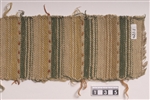 Provlapp med fyra sammanhängande vävprov i kypert. Varp i beigt bomullsgarn. Proven skiljs åt av korta partier i tuskaft med inslag i varpgarnet. Inv.nr 421:1Möbeltygsprov i oliksidig spetskypert med flotterande mönsterinslag. Varp i beigt bomullsgarn. Dubbelt inslag i beigt, gult och grönt entrådigt ullgarn och oblekt lingarn i botten och mönstertrådar i brunrött entrådigt ullgarn tillsammans med brunt lingarn. Regelbundet randigt mönster där gula, gröna och beigea ränder tonar in i varandra. Mönsterinslagen återkommer på varannan beige rand. Provet har två stadkanter, är 270 mm långt och den lösa kortändan är ofållad.Inv.nr 421:2Möbeltygsprov i oliksidig diagonalkypert. Varp i beigt bomullsgarn. Tredubbelt inslag i grönt, ljusgrönt, beigt, gult, brunrött, mörkbrunt och brunt entrådigt ullgarn och grönt, ljusbrunt och halvblekt lingarn. Mönstret består av beigt/brun/gul/röda bårder med varierande utseende på en grönmelerad botten. Provet har två stadkanter och är 200 mm långt. Inv.nr 421:3Möbeltygsprov i oliksidig spetskypert med flotterande mönsterinslag. Varp i beigt bomullsgarn. Dubbelt inslag i beigt, gult, brunrött, mörkbrunt och brunt entrådigt ullgarn och gult och halvblekt lingarn i botten och mönstertrådar i mörkbrunt och brunt entrådigt ullgarn tillsammans med ljusbrunt lingarn. Regelbundet randigt mönster där gulabeigea, brunmelerade och brunröda ränder tonar in i varandra. Mönsterinslagen återkommer på varannan gulbeige rand. Provet har två stadkanter och är 195 mm långt. Inv.nr 421:4Möbeltygsprov i oliksidig kypert. Varp i beigt bomullsgarn. Dubbelt inslag i mörkbrunt, grönt och grått ullgarn tillsammans med oblekt och grönt lingarn. Mönstret består av bruna och gröna ränder som tonar in i varandra. Provet har två stadkanter, är 170 mm långt och den lösa kortändan är ofållad.