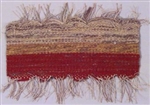 Vävprov.Varp i oblekt lingarn med inslag i hårgarn. Vävprovet har bottenbindning i inslagsrips med 4-5 trådar i inslaget, över och under två varptrådar. Mönstret är randigt i rödbrunt, gulgrönt och grå toner. Varje rand har grått inslag.Vävprovet är ofållat och har lösa varptrådar.