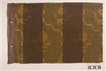 Vävprov i damast. Varp i mörkt gult och brunt lingarn och inslag i brunsvart lingarn. Stiliserade blomsterkvistar är symmetriskt utplacerade på en botten av breda bruna och gula ränder. På ena kortsidans baksida finns ett brunt bomullsband påsytt för upphängning. På denna kortsida finns också två öljetter av plåt. Tre sidor har kastsömmar.En papperslapp med handskriven text är fästad vid väven:"Värmland No 837 Bredd:100cm Pris:28:- pr.m"Enligt uppgift är denna typ av väv ämnad att användas som möbeltyg.