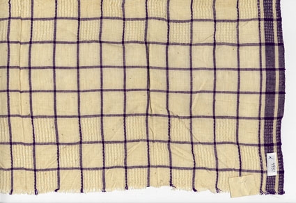 Vävprov i tuskaft och myggtjäll. Varp och inslag i lila och vitt bomullsgarn. De lila, smala ränderna bildar ett rutigt mönster. Gruppvis, i tvärgående partier, är varannan ruta vävd i tuskaft och varannan i myggtjäll med tuskaftsränder. De tuskaftsvävda rutorna dominerar dock på väven som helhet. Provet är ofållat och har en fasttråcklad papperslapp med prisuppgiften "25:-" i ett av hörnen.