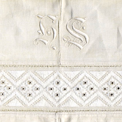 Överlakan i blekt linneväv.med broderi och monogram i vitt. Infällt broderi om 65 mm med plattsöm omgivet av hålsöm. Monogram "HS" i stjälksöm och plattsöm. HS står för Hanna Svanholm som vävt och broderat lakanen i Sunnanåker, Ytterlännäs sn. Lakanen hopsydda för hand av två längder om 710 mm. Långsidor med stadkant och nedtill maskinfåll. Något missfärgat i överkant och sidveck. Slithål på mitten.Enligt gåvohandling är lakanen skänkta av Karin Ölund född Svanholm född 4 april 1928 i Ytterlännäs sn död 13 augusti 2002 i Uppsala. Karin är dotter till Hanna (Johanna) Kristina Svanholm, 1884-1954, gift Ölund. Karins mormor är Kristina Svanholm,1848-1933. Gåvan består av ett stort antal textila föremål. Se gåvohandlingar daterade 1999-11-08 samt 2001-01-16.