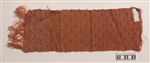 Möbeltygsprov i tuskaft med flotteringar. Varp i ljust rostrött bomullsgarn. Inslag i ljust rostrött lingarn samt två nyanser rostrött, beige och lila ullgarn. Provet har tre olika färg- och materialkombinationer med rostrött. En del roströda trådar i ull- och lingarn i varje inslag. En del med rostrött och beige samt en del med rostrött och lila. Provet har ett mönster med flotterande inslagstrådar över tuskaftbotten. Provet har två stadkanter och övriga sidor ofållade.Se även inv.nr 6074