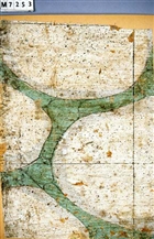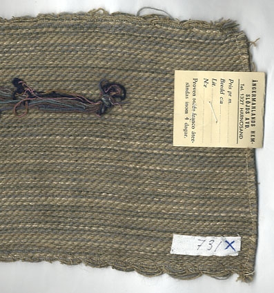 Möbeltygsprov i oliksidig kypert. Varp i grått bomullsgarn. Inslag i grått, blågrått, grönt och vitt ullgarn. Tre trådar i olika färgkombinationer i varje inslag. På provet är garnprover i färgerna brunt, grått, gråblått, blågrönt, mörkblått ullgarn och ljust lilabomullsgarn fästade. Provet har en stadkant. Maskinsöm i vitt längs övriga sidor.På provet en pappersetikett fäst med vit sytråd. Förtryckt text saknar ifyllda uppgifter:"ÅNGERMANLANDS HEM-SLÖJDS AVD.Tel. 1327 HÄRNÖSANDPris pr m.Bredd c:aLit.N:rProven torde franco åter-sändas inom fyra dagar."