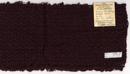Vävprov i tuskaftsbindning. Varp och inslag i mörklila ullgarn i två nyanser. Inslagen, som sammanspolats fyra och fyra, löper över två och under två varptrådar.Provet har kastsöm längs långsidorna. Denna typ av väv är ämnad att användas till ett draperi.