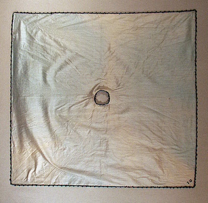 Klänning i svart taft utan ärmar med löst liv och långa ärmar samt skyddstyg i bomull för klänningen. Beskrivs på två blanketter som inv.nr 8241:1-2 klänning med lösa ärmar samt inv.nr 8241:3 skyddstyg.Inv.nr 8241:3Skydd för klänning i blått bomullstyg med virkad kant och broderat monogram. Kvadratiskt bomullstyg i blågrönt med hål i mitten för galgens krok. Runt hålet och alla fyra sidorna en virkad kant i svart kraftigt bomullsgarn. Broderat monogram "IO" i svart bomullsgarn i ena hörnet. Ett vitt bomullsband fastsytt på baksidan med handskriven text i svart tusch: "Gunnel Ovemar"Hålets diameter 50 mmVid gåvotillfället hängde skyddet över inv.nr 8241:1-2 klänning med lösa ärmar och har ägts av Ingrid Olsson född 24 april 1899 i Bjurholm, Västerbotten död 9 februari 1932 i Österforse, Ångermanland. Dotter till Gustaf Olsson född 1864 och skräddarmästare i Bjurholm. Ingrid utexaminerad från folkskoleseminariet i Umeå år 1918 eller 1919. Ingrid Olsson träffade sin man Axel Olsson född 13 december 1896 i Ytterlännäs död 1969 i Sollefteå, vid tjänstgöring vid en skola i Rundvik, Nordmaling. Paret förlovade sig 1923 och äktenskap ägde rum i Ytterlännäs kyrka augusti 1924. Paret fick två döttrar i Österforse, Ångermanland Gunnel född 1925 och Karin född 1930.