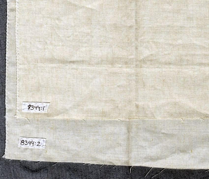 Två lakansvävprover i tuskaft. Varp och inslag i naturvitt bomullsgarn. Proverna saknar stadkant och har kastsöm längs långsidorna.8344:1 Längd 530 mm, bredd 265 mm8344:2 Längd 530 mm, bredd 280 mmEnligt gåvohandling har vävprovet tillhört Elin Rudén (1904-1970), Backe, Fjällsjö sn. Dotter till Per Rudén och hans hustru Hanna född Kjellsson. Elin utbildade sig till vävlärarinna vid Brunssons Vävskola, Stockholm i slutet av 1920-talet. Största delen av sitt liv tillbringade hon på gården i Backe och utförde en del beställningsarbeten hemifrån. Gåvan består av arbetsprover, arbetsböcker och mönster och skänkta av Elin Rudéns halvsystrar.Se även inv.nr 4152 räkning från Emma Wiberg till Elin Rudén