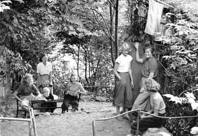 Fr.v. Lena Aronsson, Birgitta Anell och framför henne i soffan Karl Magnus Anell, Britta Kjellberg, Birgitta Eriksson, Monica Eriksson med handen på dörrkarmen till kojan som flickgänget har byggt. Sittande längst t.h. är Stina Kjellberg.
