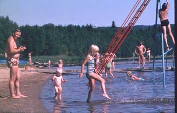 Bildnummer: Fo-19980590 Ur Ådalens släktforskarförenings bildarkiv Motivord: Badanläggning Plats: Skog Kramfors Ångermanland Fotot är daterat till 1976Tillhör bildsamling: Fritid och turism 1977/ 1:100 kort 28.Storsjön. Storsjöbadet.