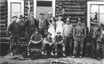 Ådalslidenbor vid Inlandsbanan på en bild från Muoskosel. Stående fr.v Jakob Oskar Eriksson, Valfrid Eriksson. Abraham? Hägglund, Olle Sjödin, Göte Eriksson, Linnéa Jansson, okänd dam från Porjus, Milton Hahlén, Erik Otto Westin, Johan Vallin och Otto Bergfors.