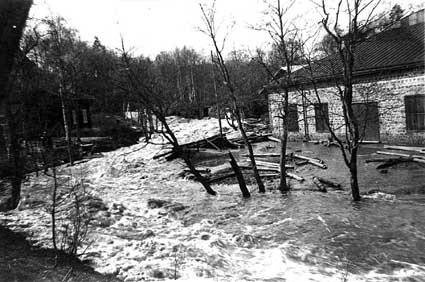 Neg 3:9. Ytterlännäs Hembygdsförening, Bollsta. FOTO-album 1-5. 57. 19x28 cm. Vårflod år 1919 vid masugnen i Bollstabruk.
