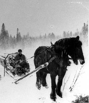 FOTO-album, bild nr 241.10:5. 18 x 24 cm. Hemmansägare Herbert Pallin, Eds by, Ytterlännäs med häst. Pallin har just lastat timmerlasset klart och ”björnat” ihop lasset med kätting.