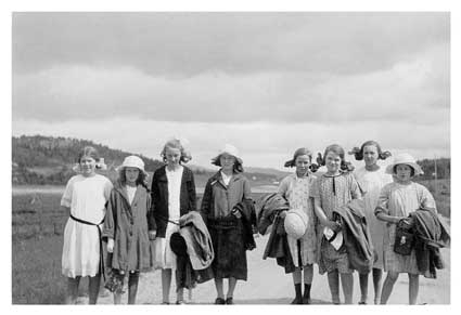 Lisa Nilsson trea från höger och trea från vänster Hildur Wahlström. Lisa Nilsson var dotter till handlaren John Nilsson, som hade affär på Vasagatan och Bygatan. När Lisa Nilsson gifte sig med Martin Holmbom startade de en ny livmedelsaffär i korsningen Vasagatan/Skolgatan. Affären fick namnet ”Nilssons efterträdare”.
