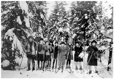 Bildnummer: Fo-8508 Ur föreningen Skönsbergs Historias bildarkiv Fotograf: Olle Lindström Plats: Sundsvall Medelpad Fotot är daterat till 1931Från SundsvallFotot är daterat till 1931Foto : Olle LindströmskidorBritta Åkerstedts längst till vänster