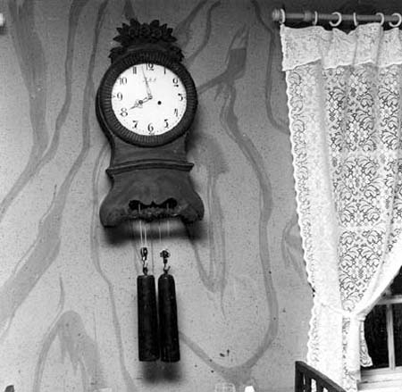 Bildnummer: Fo-A12429 Mapp: 523 Ur Länsmuseet Västernorrlands bildarkiv Motivord: Gästgiveri, Interiör, Museiföremål, Väggklocka Fotograf: Kjell Jonsson Plats: Härnösand Ångermanland Fotot är daterat till 1971Spjutegården, matsalen i bottenvåningen.