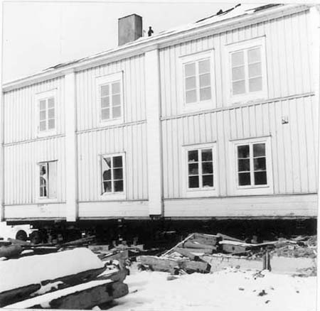 Huset Östanbäcksgatan 24 upplyft på vagnar, vänt i färdriktning genom trädgården ner mot Östra Kanalgatan.