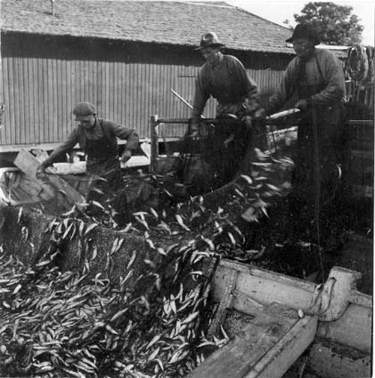 Bildnummer: Fo-A14404 Mapp: 418 Ur Länsmuseet Västernorrlands bildarkiv Motivord: Fiskare, Fiske, Man Fotograf: Viktor Lundgren Plats: Trysunda Nätra Örnsköldsvik Ångermanland Fotot är daterat till 1934Strömingen skakas ur skötarna.