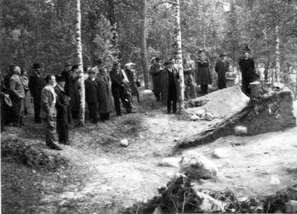 Bildnummer: Fo-A2140 Mapp: 362 Ur Länsmuseet Västernorrlands bildarkiv Motivord: Arkeologi, Arkeologisk undersökning, Gravfält, Gravhög Fotograf: Bo Hellman Plats: Holm Överlännäs Sollefteå Ångermanland Fotot är daterat till 1949Professor Bröndsted (ej synlig) demonstrerar utgrävningsplatsen.