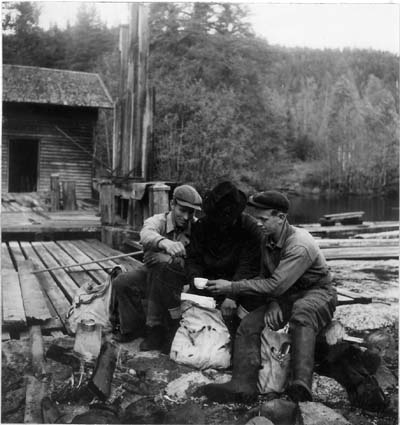 Bildnummer: Fo-A22062 Mapp: 360 Ur Länsmuseet Västernorrlands bildarkiv Motivord: Arbetsrast, Flottare, Man Fotograf: Viktor Lundgren Plats: Överlännäs Sollefteå Ångermanland Kaffepaus under flottningen. Johannes Höglund, Karl Edin, Rune Höglund.
