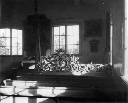 Korskranket tillverkad av Ewert Friis, verksam i Gävle men även i Medelpad. Det är tillverkad på 1660 - talet, rikt snidat med plastiska slingor runt en vindruvsklasse och ett krönande puttiansikte.